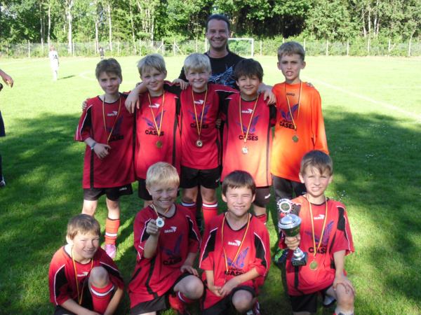 Letztes Saisonspiel, 27 Grad auf dem Spieker und das Derby gegen den direkten Konkurrenten Bergedorf 85. Auf Grund sehr vieler Absagen traten wir mit stark veränderter, aber hoch motivierter Mannschaft an. Der 11:0 Sieg des ETSV machte es für uns nahezu unmöglich, den 2. Tabellenplatz zu halten. Trotzdem legten wir los, wie die Feuerwehr. Dem 1:0 durch Leon in der 5. Minute folgten bis zur 11. Minute 3 weitere, jeweils toll herausgespielte Tore zum 4:0. In der 12. Minute konnte dann auch Bergedorf eine von zahlreichen Torchancen nutzen. Bis dahin und weiter bis zur Halbzeit konnte unsere neu formierte Abwehr dem Druck der stark aufspielenden Bergedorfern stand halten. Nach dem Wechsel merkte man unseren Jungs das 8-stündige Turnier vom Vortag deutlich an. Es ergaben sich für uns zwar noch einige Chancen, die wir aber auf Grund mangelner Kraft allesamt vergaben. 85 kam immer stärker auf und wir konnten nicht mehr entschlossen dagegen halten. So kam es, dass Bergedorf in der 33., 34. und 38. Minute treffen und somit das Spiel ausgleichen konnte. Ein insgesamt verdientes Unentschieden, da wir in der ersten Halbzeit und Bergedorf in der zweiten Halbzeit überlegen gespielt haben.